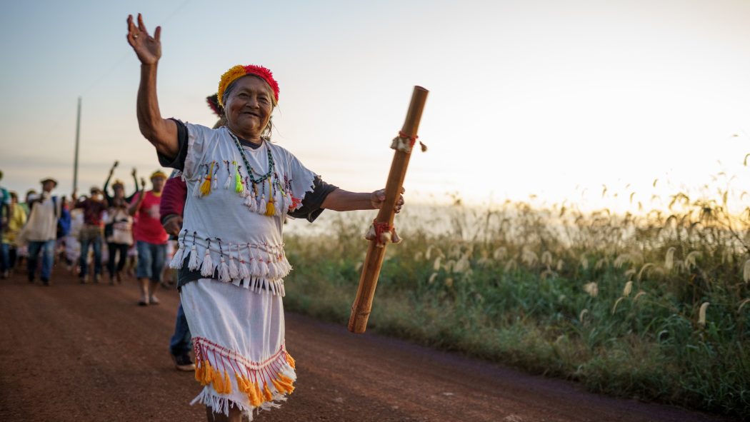 “Eles piscavam a luz, começando de noite e indo até as seis horas da manhã. Toda noite recomeçava. E, enquanto eles acendiam aquele farol do carro, o povo dançava, cantava, rezava. É a única coisa que a gente tinha”, recorda-se Mboy Jeguaju, outra liderança feminina do tekoha Yvy Ajere. “A violação, a agressão… tudo isso nós passamos”.