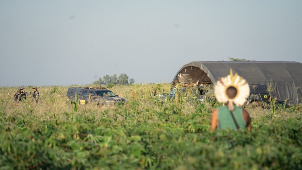 Na manhã de março de 2025 em que as lideranças do território recordavam os dias de cerco e violência, o acampamento ruralista já estava desfeito; além dos relatos, outro acampamento próximo do tekoha Yvy Ajere, o da Força Nacional, lembrava que a tensão daqueles dias, que deixaram sequelas e feridas, ainda não está totalmente dissipada.